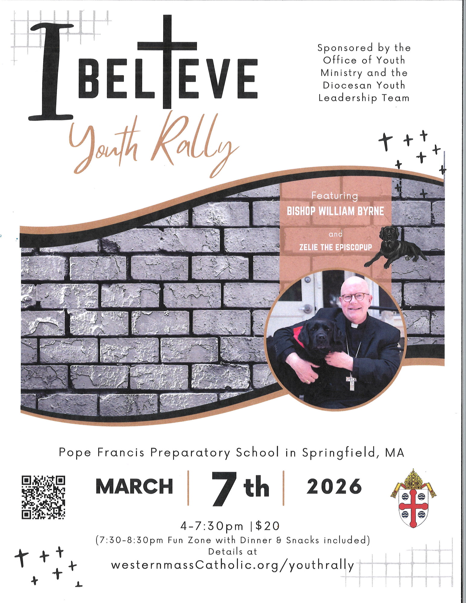 The Diocesan Youth Leadership Team invites all middle and high school teens to the I Believe Youth Rally on Saturday, March 7, 2026, from 4:00–7:30 PM at Pope Francis Preparatory School in Springfield! Join Bishop William Byrne and everyone’s favorite four-legged friend, Zelie the Episcopup, for an evening full of fun, music, prayer, and community. Stick around for the Fun Zone from 7:30–8:30 PM with dinner and snacks included! Register and learn more at: westernmassCatholic.org/youthrally .