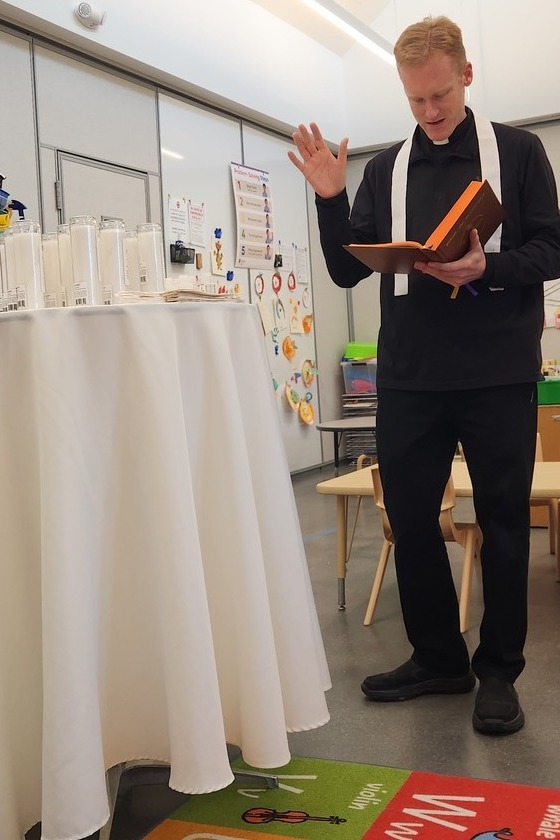 Students receiving their candle & holy water take home bags