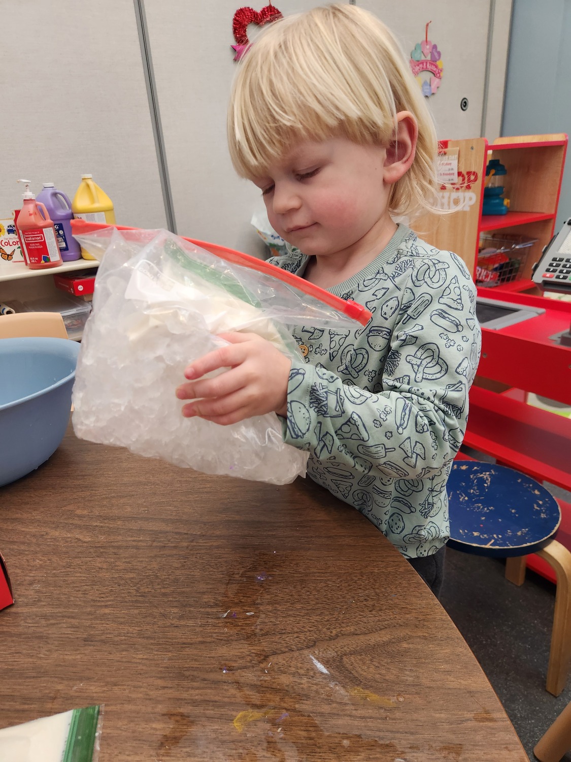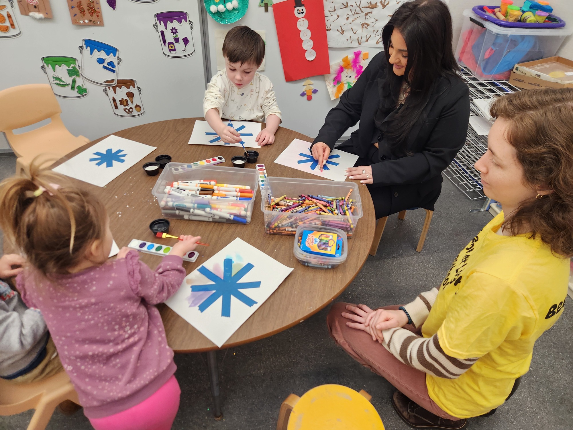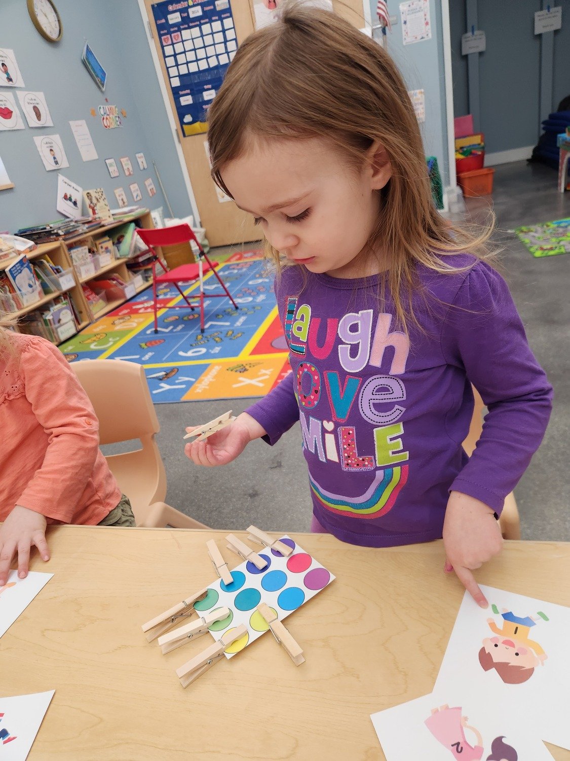 Our art center with plenty of Play-Doh, markers, crayons, glue, popsicle sticks, and paper to inspire our littlest learns to explore and create what they envision.