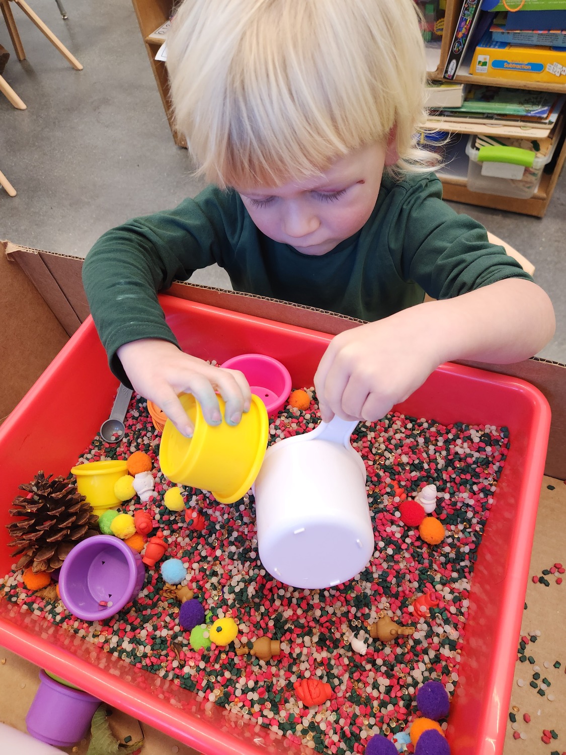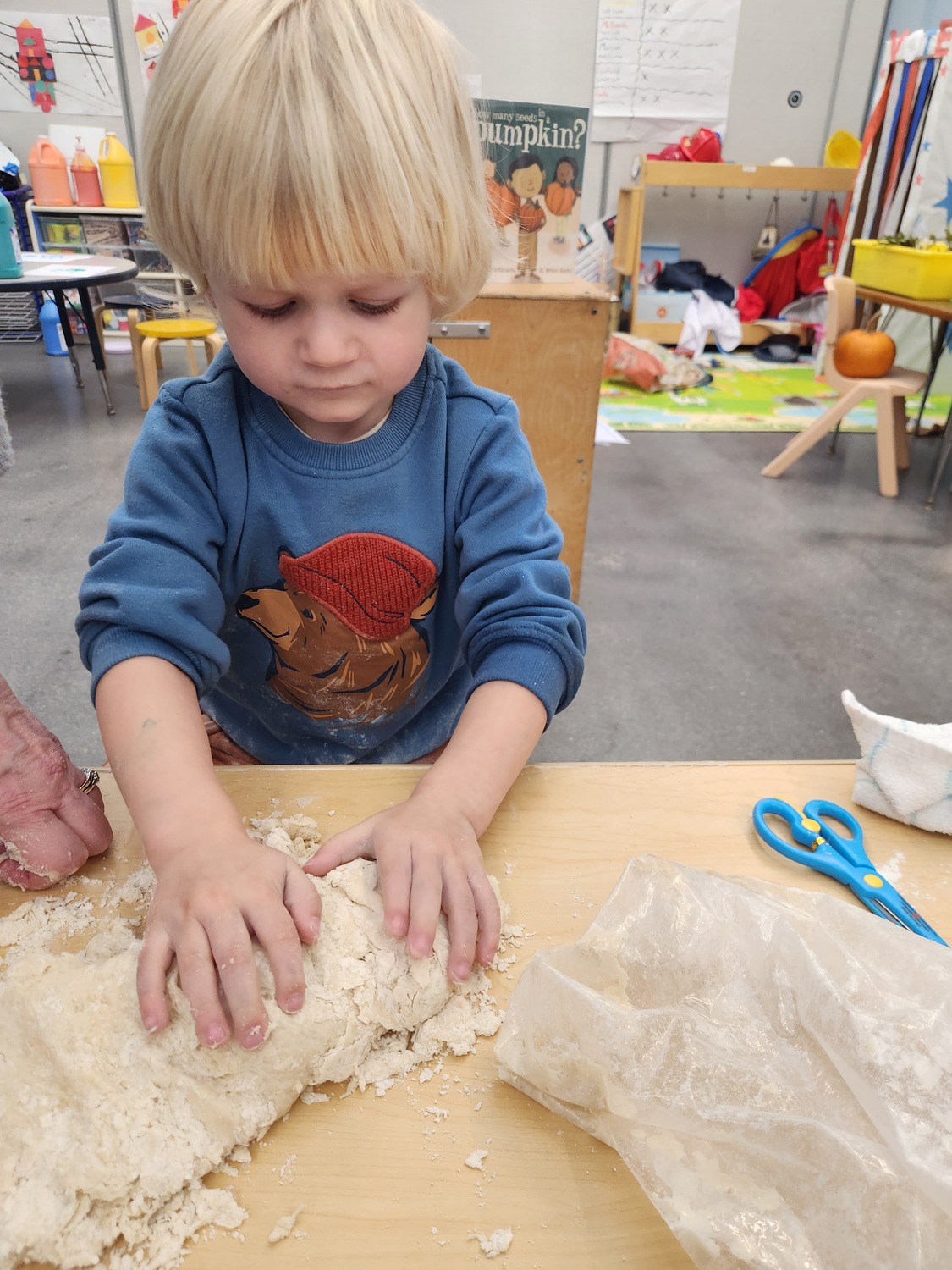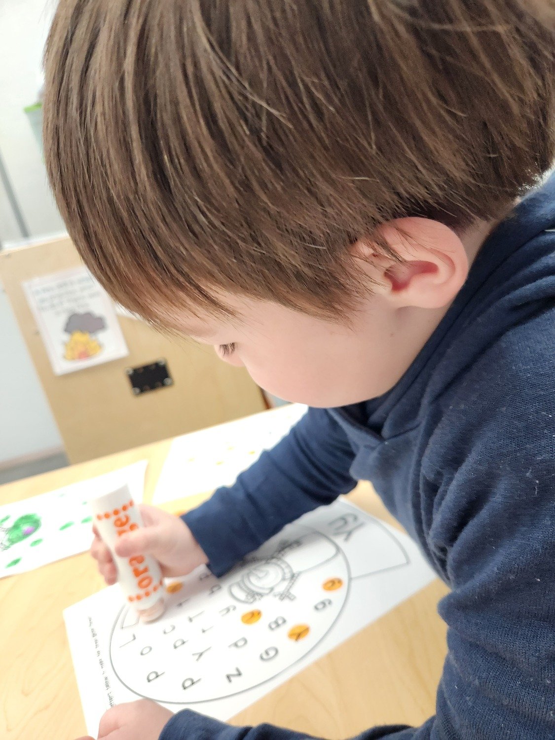 Our art center with plenty of Play-Doh, markers, crayons, glue, popsicle sticks, and paper to inspire our littlest learns to explore and create what they envision.