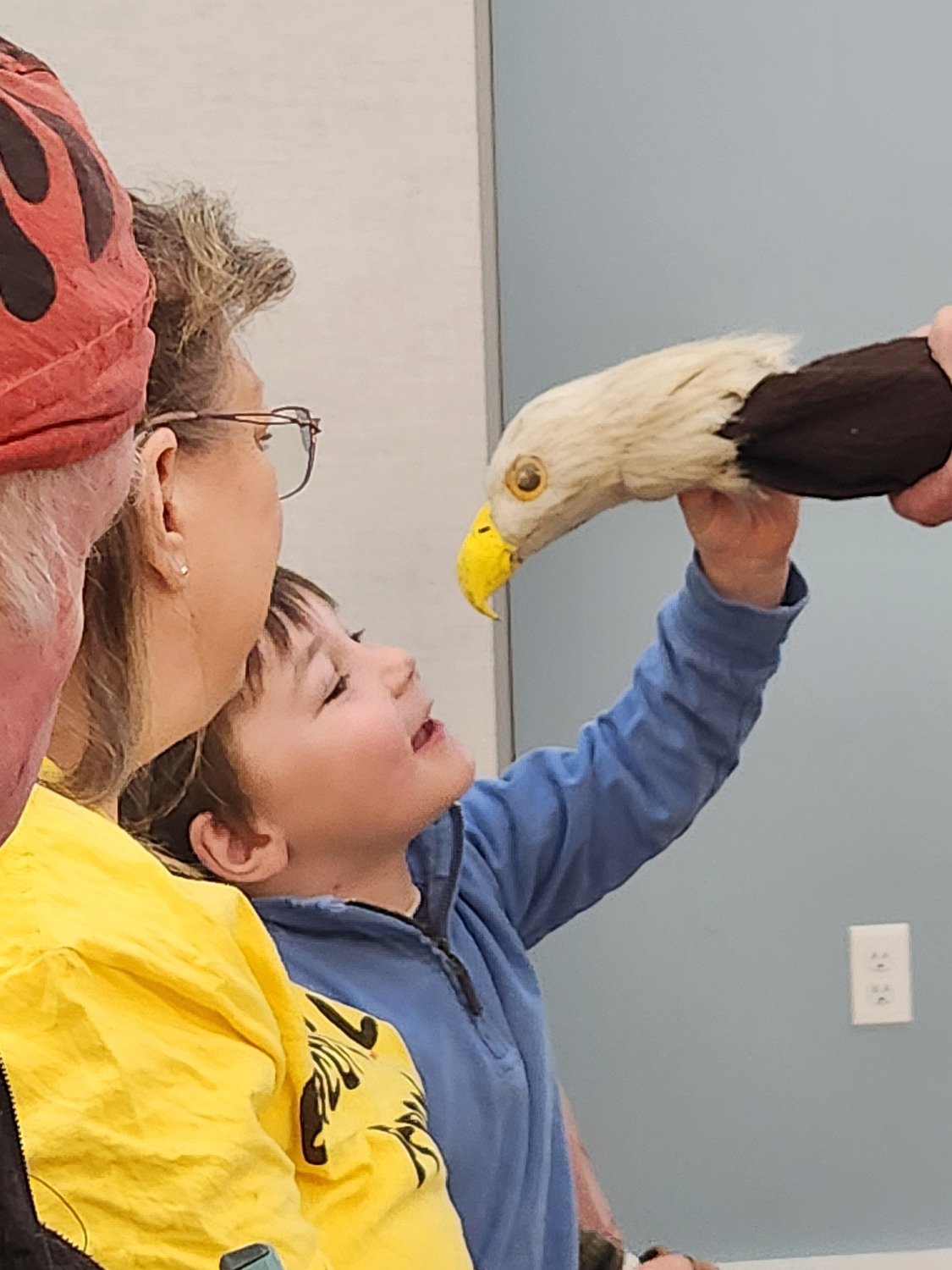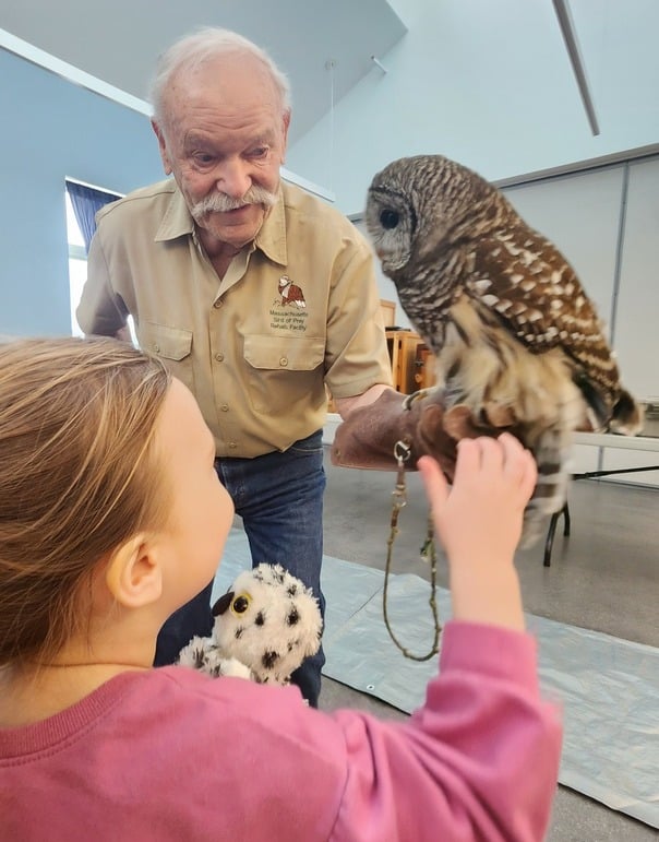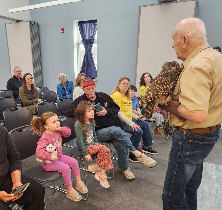 January 14 at 10:30 Tom Ricardi from the Massachusetts Birds of Prey Wildlife Rehab Facility in Conway brought 5 of his live birds to teach us about how we can help birds of prey in our area and the amazing ways they have learned to adapt to life around humans.