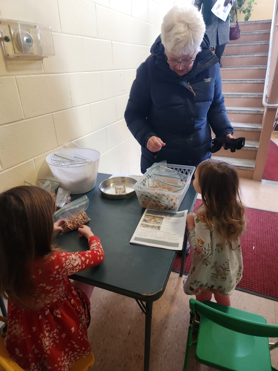 Jan 17 & 18 Bird Feeder Fundraiser- As a service project for our unit on how animals survive the winter, students made pinecone & bagel birdfeeders with sun butter and bird seed. Students were able to bring their own bird feeder home and extras were made for anyone interested in taking one home after masses on Saturday & Sunday. Even the string used to hang the feeders can be used by the birds for their nest! I'm sure a squirrel or two will also appreciate the special treat this winter! The fundraiser was a great success and proceeds go towards supporting the preschool in purchasing books and supplies to help our youngest learners have access to new, hands-on materials that provide the best foundation for a lifelong enthusiasm and love of learning.